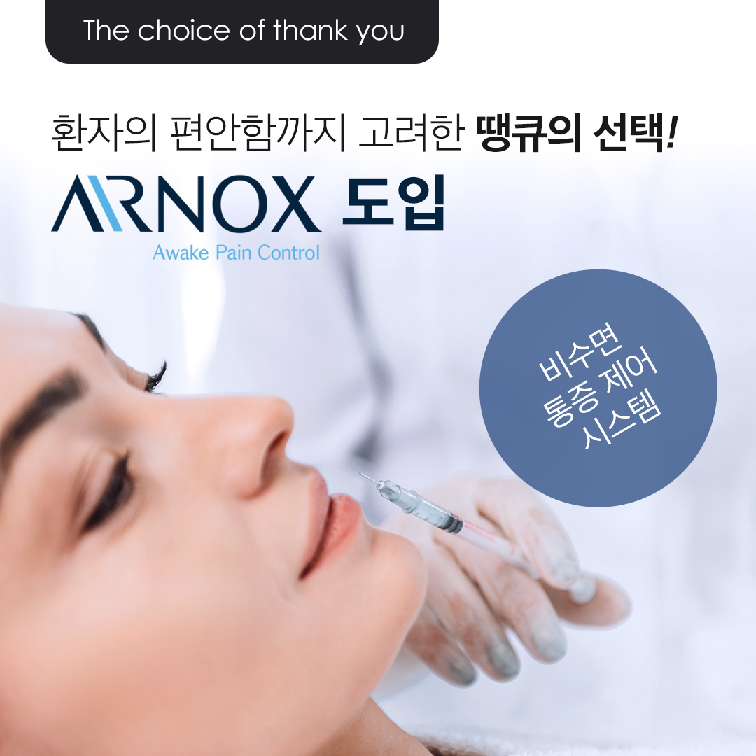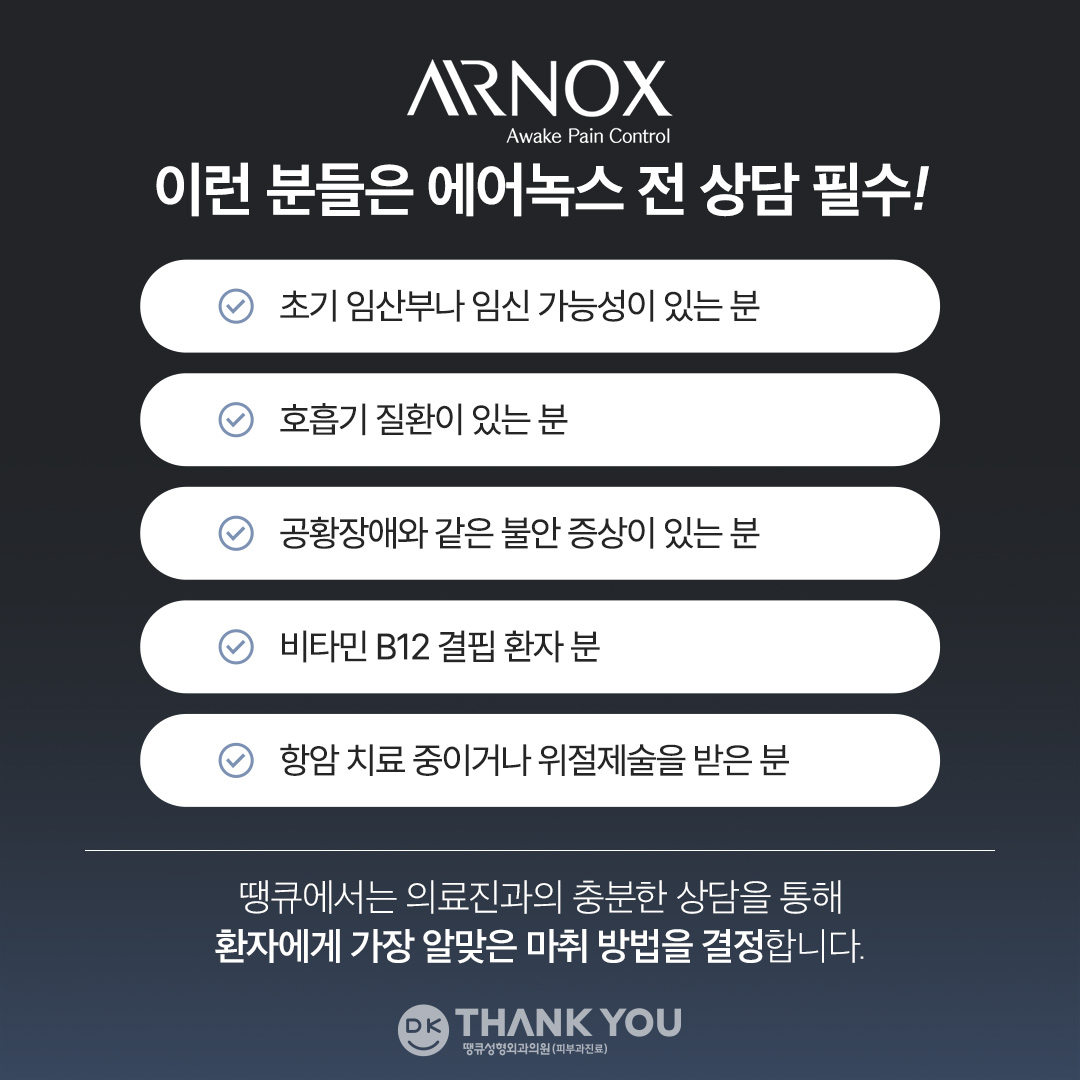 수면 마취 시 겪었던 불편함, 부담감을 덜어드리고자 땡큐에서 도입한 에어녹스는 아래와 같은 특징을 가지고 있습니다. ✔ 10분 이내의 마취 시간 ✔ 통증 강도 제어 가능 ✔ 2분 이내의 회복 시간 ✔ 시술 후 바로 운전 가능 ✔ 일상 복귀 바로 가능 마취와 회복에 소요되는 시간이 길지 않아 시간적 부담이 없으며, 의식이 있는 상태이기 때문에 이에 대한 두려움을 가지신 분들도 부담 없이 편하게 시술을 받아보실 수 있습니다.